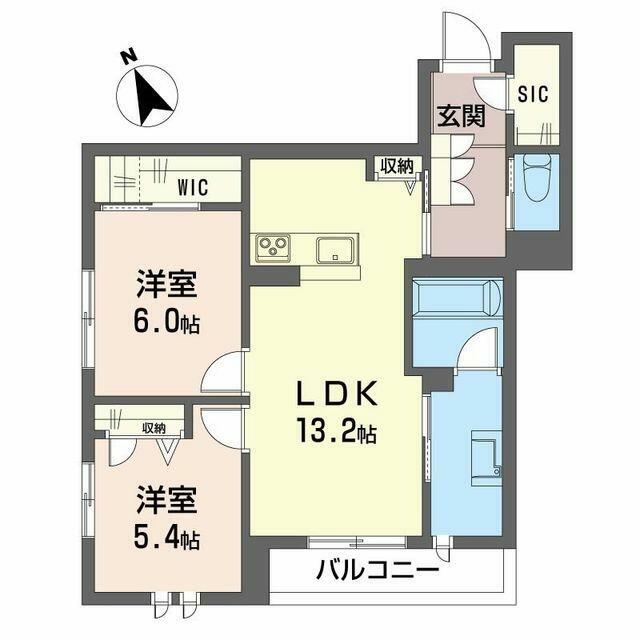 | 間取り | 2LDK(LDK13.2帖 洋室6.0帖 洋室5.4帖) | 主要採光面 | 南 |